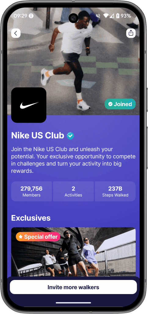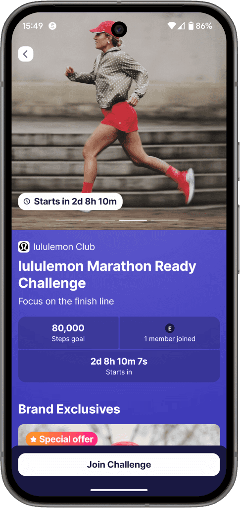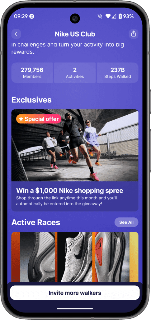 Create an always-on branded hub inside Sweatcoin to publish content, run challenges, and nurture loyal customers. Regular in-app touchpoints and scheduled communications build retention and LTV. Ask about packages or how Clubs combine with Challenges for spikes