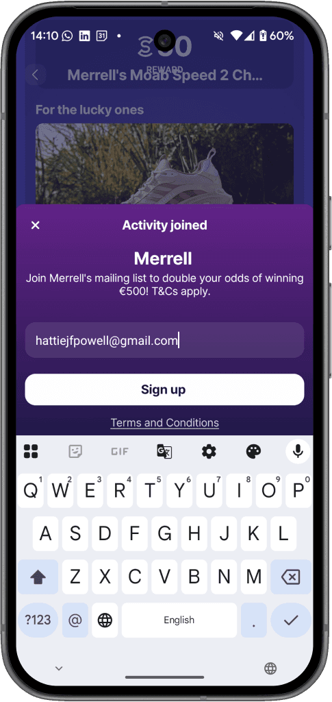 Working with Sweatcoin on the recent Merrell campaign was a genuine pleasure. The Sweatcoin teams professionalism was key to its success. Their collaborative spirit ensured the overall campaign setup and execution were a huge success, absolutely smashing the European lead and participation numbers!